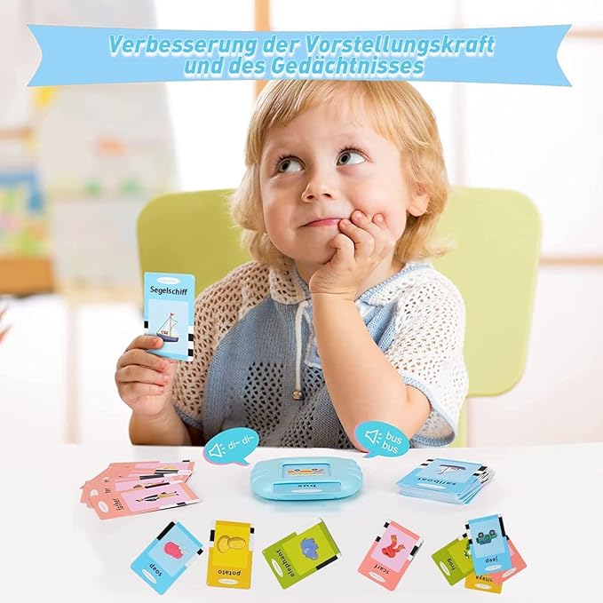 Die Karten besitzen verschiedene Muster und Vokabeln auf beiden Seiten. Kinder können bspw. verschiedene Tiere, Fahrzeuge, Lebensmittel, Obst, Farben und tägliche Notwendigkeiten spielend lernen.